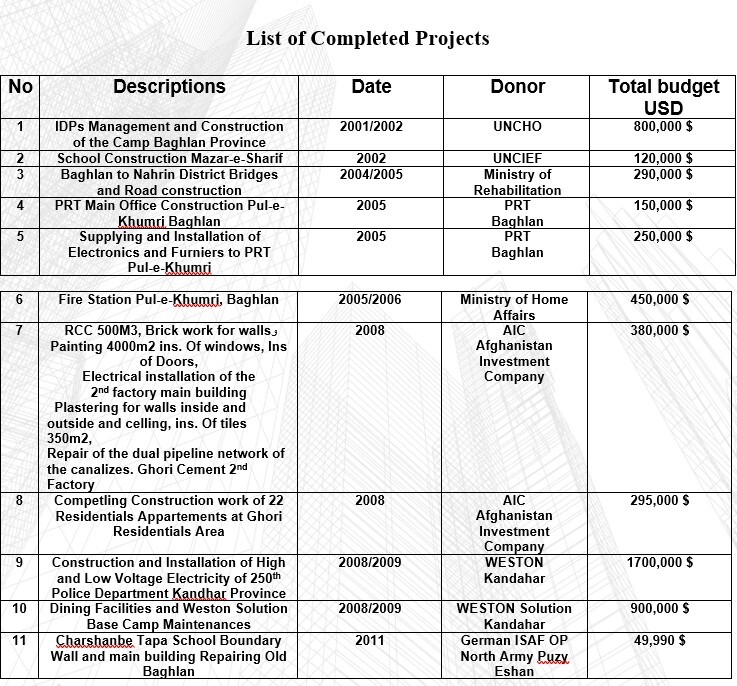 Lemar Waziri Construction Company (LWCC) was established in 2005 following the Bonn Agreement and the creation of new interim government in Afghanistan and the international community support for rebuilding Afghanistan. LWCC is a Kabul based constriction and consultancy firm carrying out independent operations in different provinces, districts and parts of the country since early 2005 consisting of a group of highly qualified and experienced experts in different private sectors.